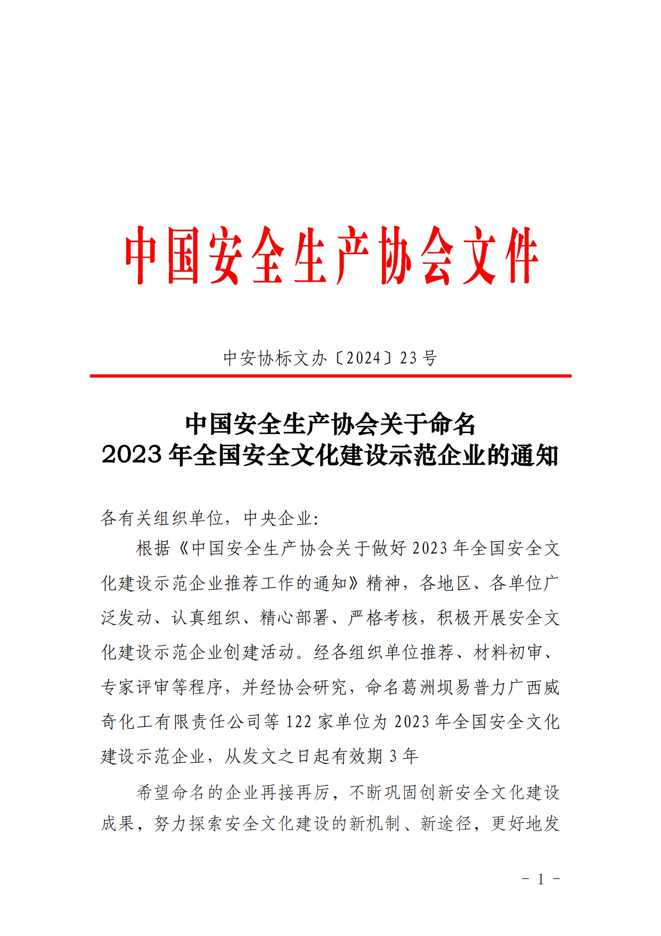 中国安全生产协会关于命名 2023 年全国安全文化建设示范企业的通知